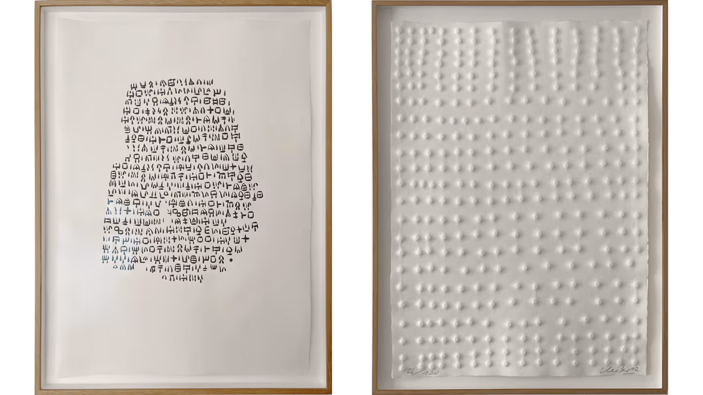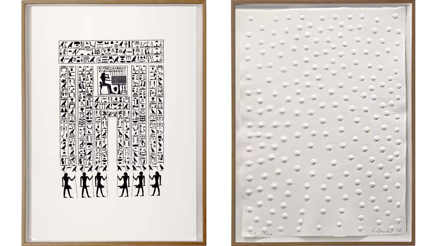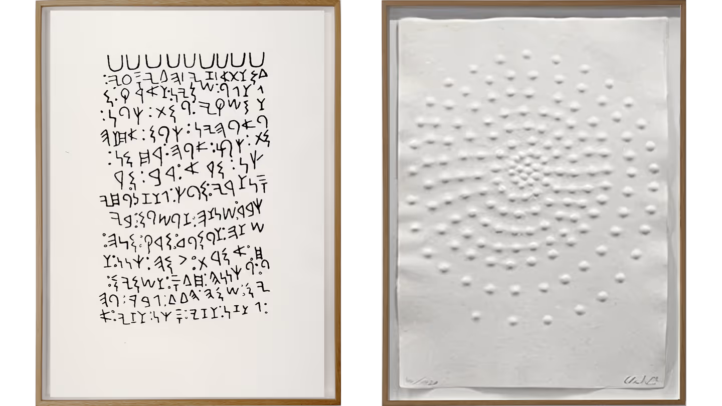 Die Nagelprägungen scheinen das Papier wie ein Echo der Handbewegung zu durchdringen, während typografische Elemente die Vielfalt der Schriftzeichen der Menschheit aufrufen. Aus diesem Zusammenspiel erwächst eine stille Poesie: Schrift wird zu Struktur, Struktur zu Sprache.